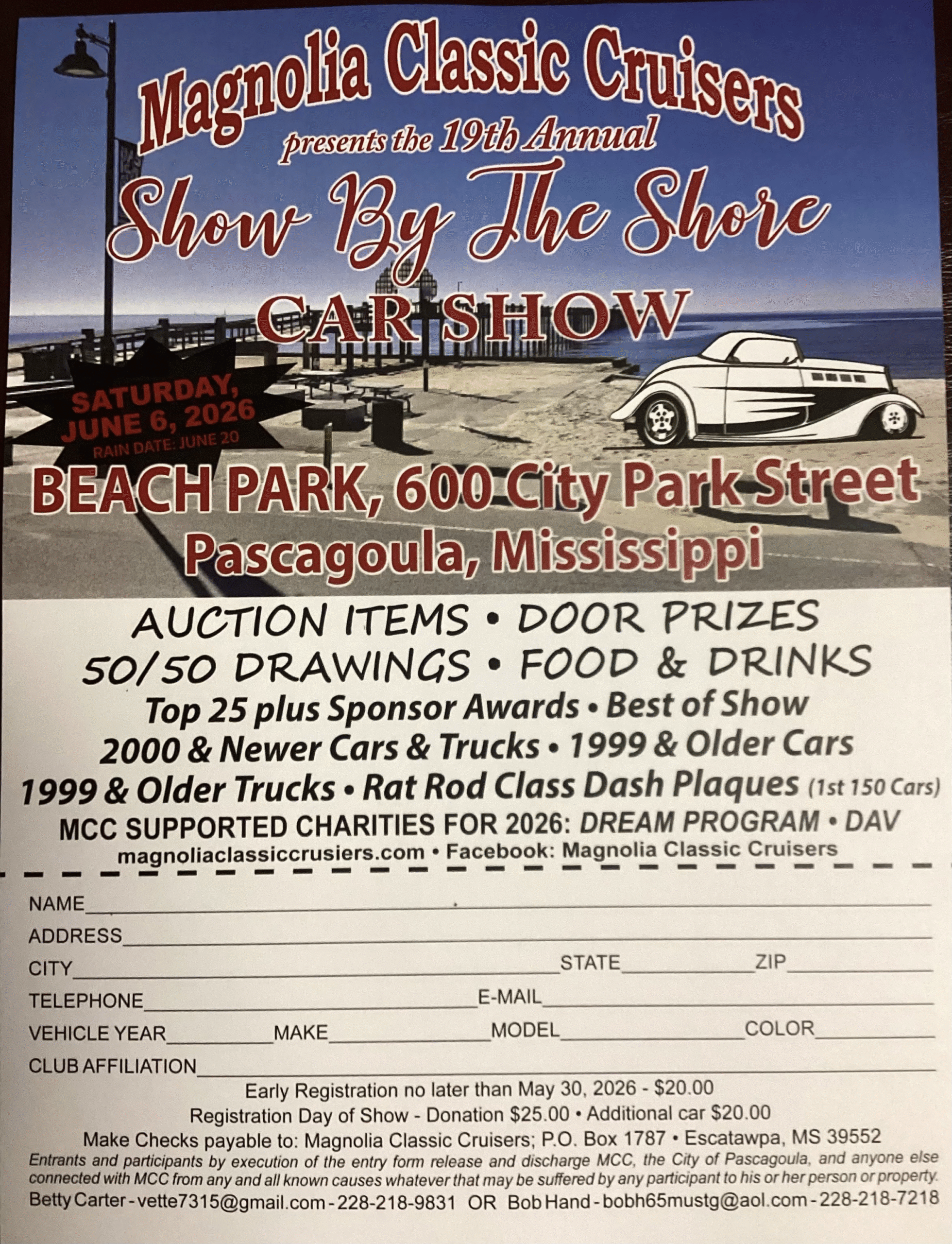 The Magnolia Classic Cruisers 19th Annual Show by the Shore is scheduled for June 6th at the beautiful Beach Park in Pascagoula, MS!